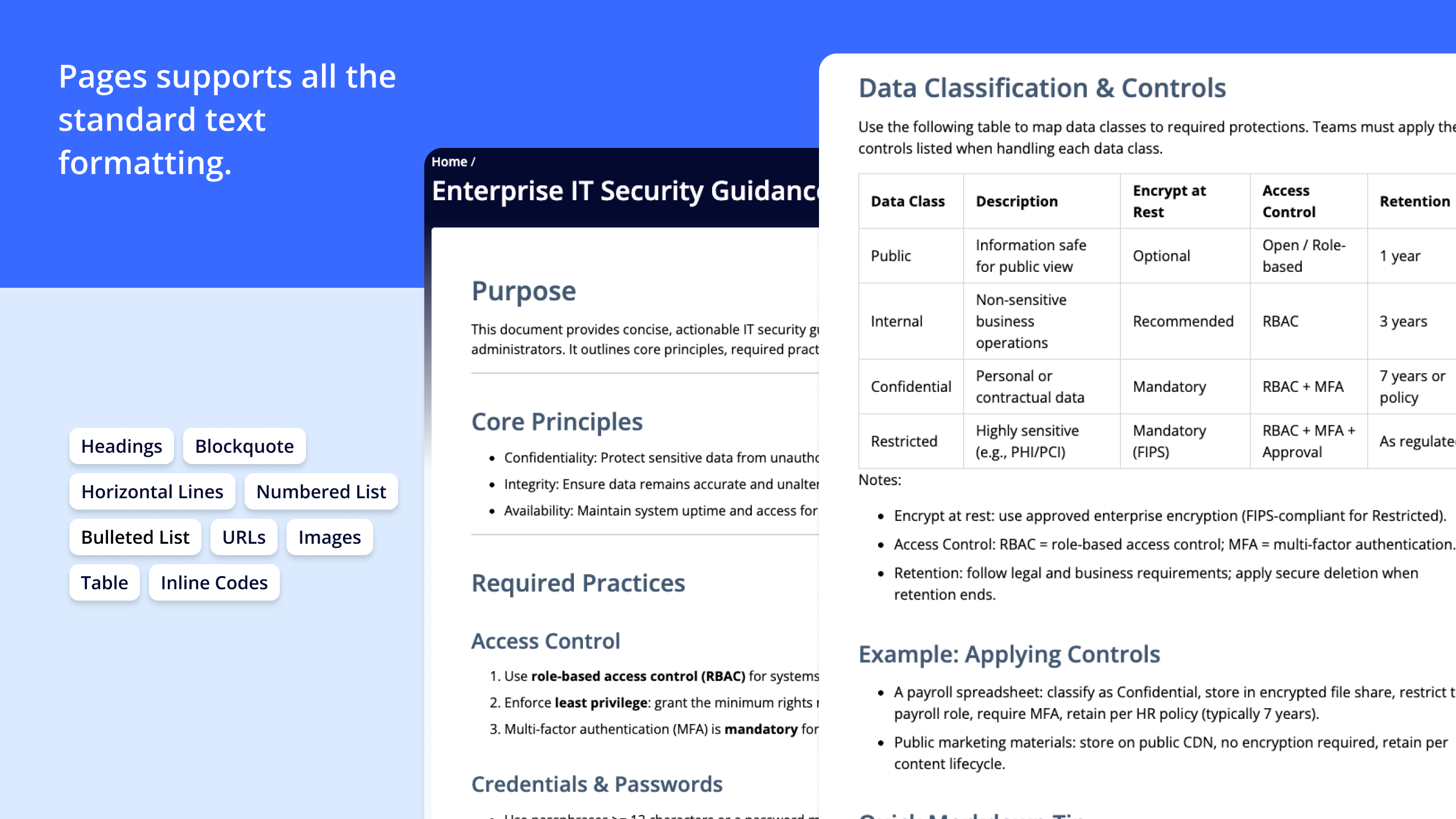 Export pages to PDF for printing or external sharing Control access:
