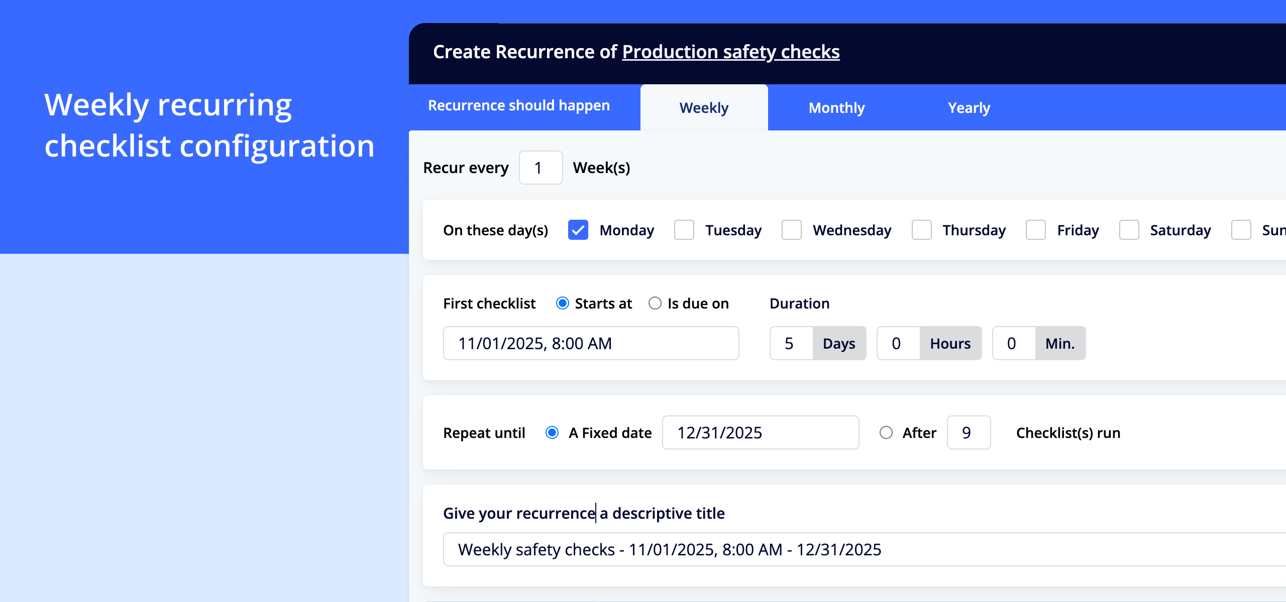 System creates new checklists automatically **Real-world example:**A mid-sized European manufacturing company uses weekly checklists for production safety checks. Every Monday at 08:00, a new checklist is created that the production manager must complete by Friday. If the check hasn’t been completed by Thursday, a reminder is sent.