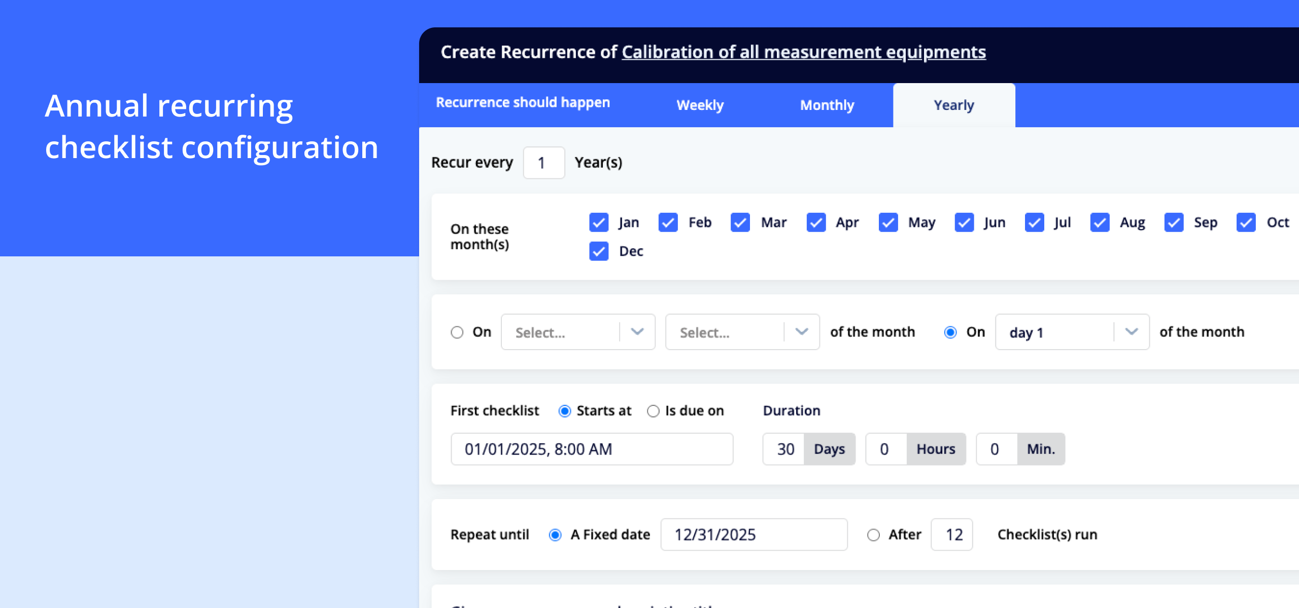 System creates new checklists automatically **Real-world example:**A laboratory company uses annual checklists for calibration of all measurement equipment. Each instrument has its own recurring checklist that’s automatically created 30 days before the calibration date. The responsible technician receives a task, performs the calibration, documents the result – and next year’s checklist is automatically created.